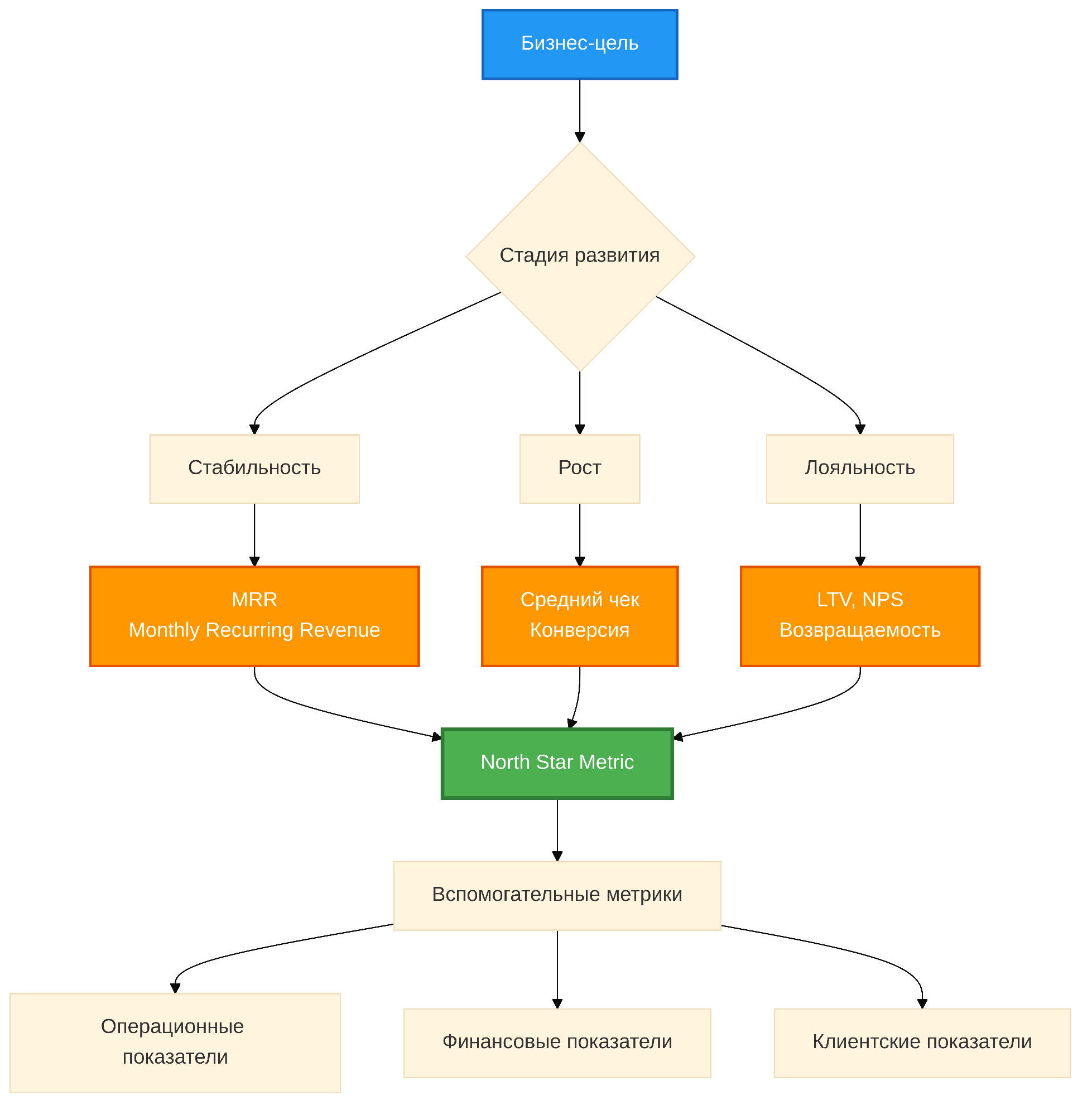 Выбор NSM напрямую зависит от текущей бизнес-цели и стадии развития вашей клиники. Например, для клиники, стремящейся к стабильности, ключевой метрикой может стать MRR (Monthly Recurring Revenue), в то время как для клиники на стадии роста — средний чек или конверсия.