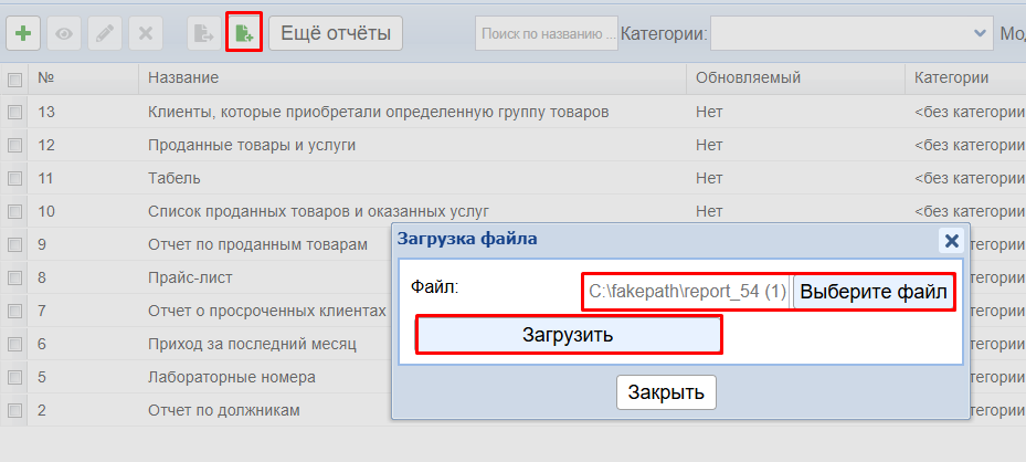 Для загрузки отчета в свою программу, перейдите в Админка — Конструктор отчетов — нажмите кнопку «Импорт». Выберите загруженный файл отчета на ПК и нажмите Загрузить.