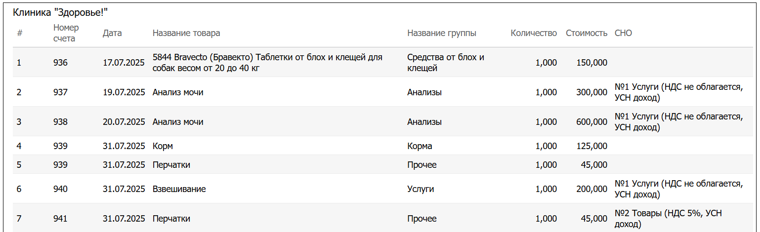 | Проданные товары и услуги | Выводит список всех проданных товаров и услуг за выбранный период по одной клинике: