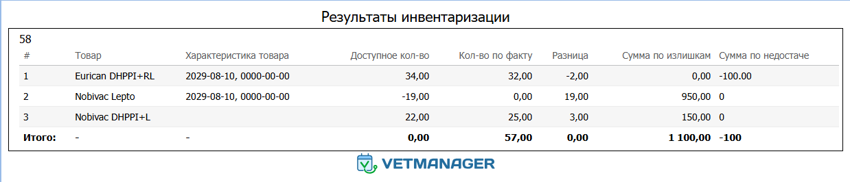 | Результаты инвентаризации | Отображает только измененные строки инвентаря с суммой разницы