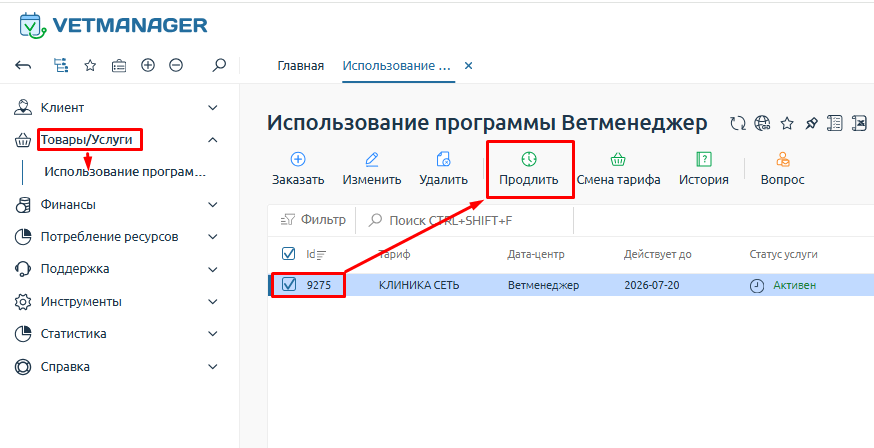 Не пополняйте баланс, а делайте продление тарифа. Для этого в биллинге нужно перейти в раздел «Использование программы», выделить ваш тариф и нажать «Продлить». Инструкция по оплате доступна здесь или здесь.