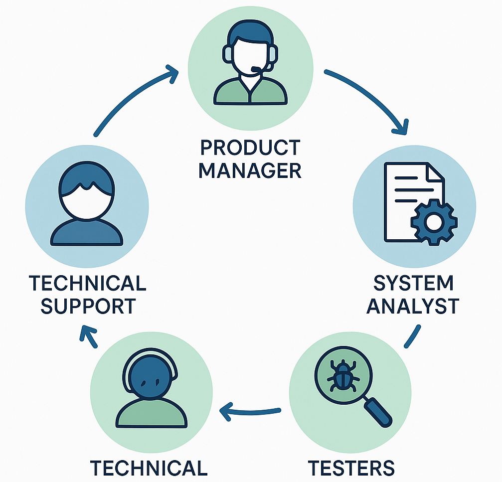 За созданием и поддержкой программы стоит слаженная команда специалистов, каждый из которых играет важную роль. Хотя в компании работает много сотрудников, включая бухгалтеров и дизайнеров, для конечного пользователя ключевое значение имеет взаимодействие со следующими отделами: